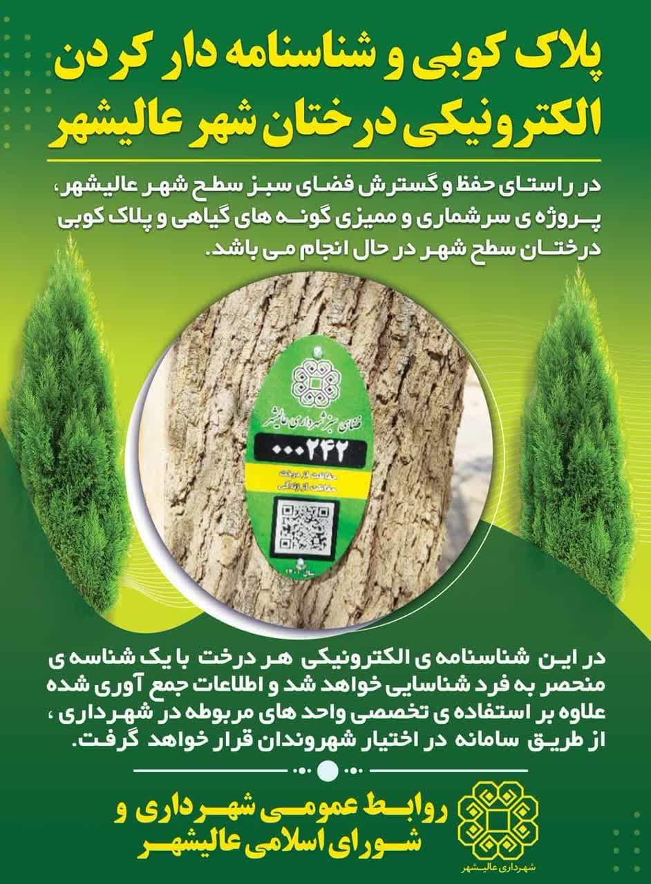 به گزارش روابط عمومی شهرداری و شورای اسلامی عالیشهر مهندس حسین محمدی شهردار عالیشهر گفت: در راستای حفظ و گسترش فضای سبز در سطح شهر عالیشهر، پروژه ی سرشماری و ممیزی گونه های گیاهی و پلاک کوبی درختان سطح شهر در حال انجام می باشد.