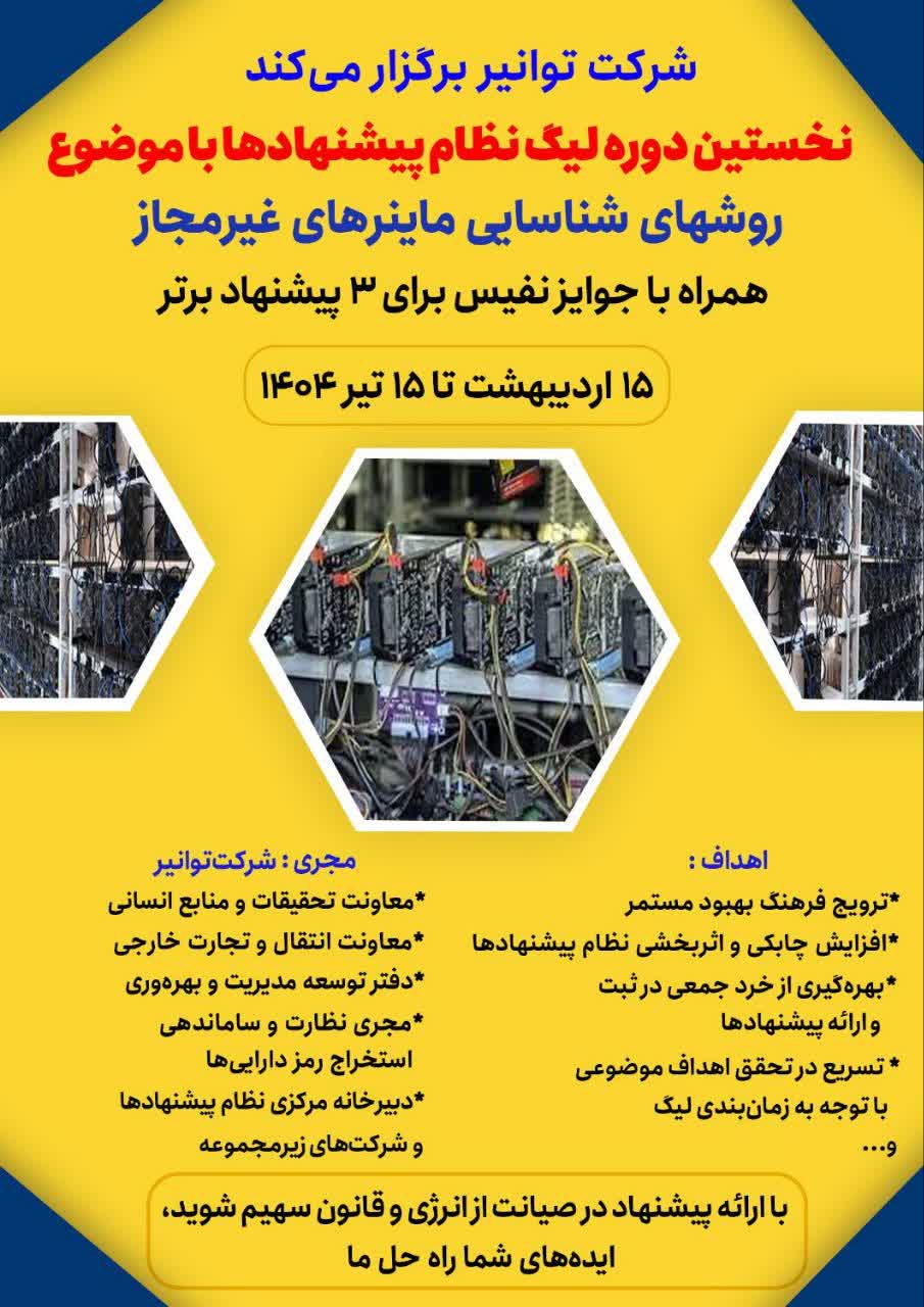 به گزارش خبر بندر و به نقل از خبرگزاری توانیر، دفتر توسعه مدیریت و بهره‌وری شرکت توانیر طی گزارشی اعلام کرد، نخستین لیگ نظام پیشنهادهای توانیر به منظور بهره‌مندی از ایده‌های خلاقانه کارکنان توانیر و شرکتهای تابعه و زیر مجموعه صنعت برق با موضوع “ارائه پیشنهاد روشهای شناسایی ماینرهای غیرمجاز ” از ۱۵ اردیبهشت آغاز شده و تا ۱۵ تیر امسال ادامه دارد.