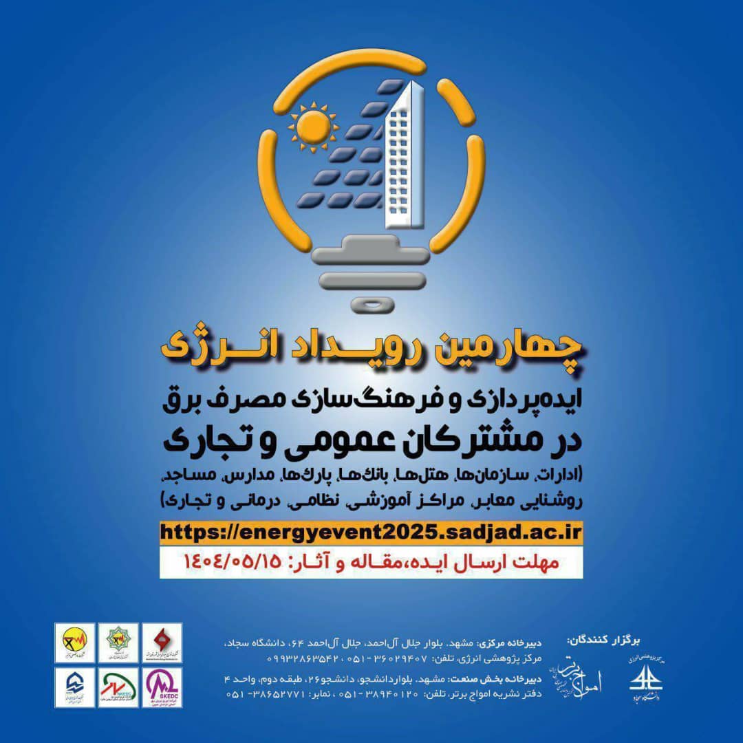 به گزارش خبر بندر،شرکت توانیر چهارمین رویداد انرژی را جهت ایده پردازی و فرهنگ سازی مصرف برق در مشترکان عمومی و تجاری برگزار می کند. این مشترکان شامل ادارات،سازمانها،هتل ها،بانک ها،پارکها،مدارس،مساجد،روشنایی معابر ،مراکز آموزشی،نظامی،درمانی و تجاری می باشند.شرکت توانیر در این راستا از مردم دعوت می نماید تا در این طرح شرکت نموده و ایده ها،تجربیات،آثارهنری و مطالعات علمی خود در زمینه مدیریت مصرف برق را با چهارمین رویداد انرژی در میان بگذارند.